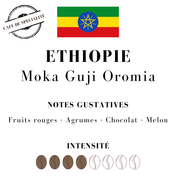Guji est une zone administrative de la région d’Oromia en Éthiopie, qui a acquis une définition politique en 2002. Avant cette année, le territoire de Guji (du nom de la tribu Guji du peuple Oromo) faisait partie de la zone de Borena. La zone de Guji partage une frontière avec la région des nations, nationalités et peuples du Sud (SNNP), qui comprend la zone de Gedeo (où se trouve Yirgacheffe) et la zone de Sidama.